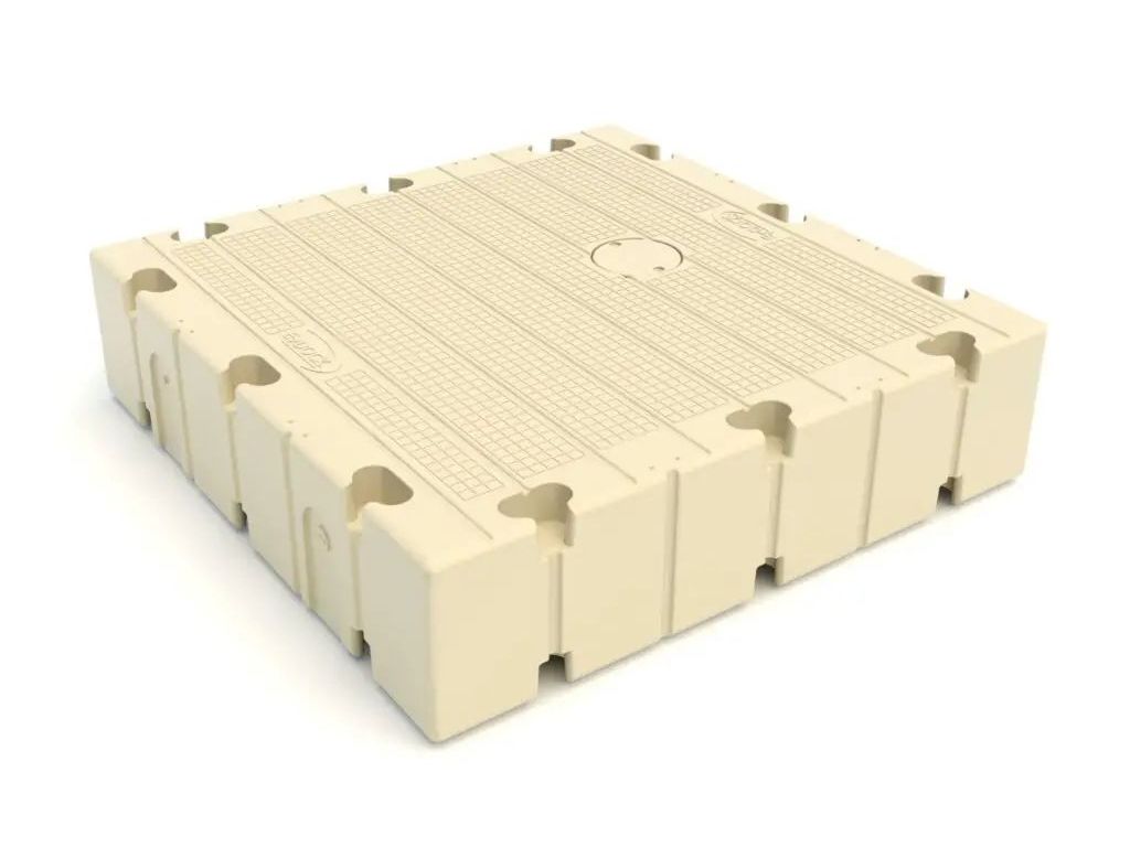 Deze polyethyleen steiger van 150x150x38 cm (60”x60″x15″) is duurzaam, antislip en onderhoudsarm, met een drijfvermogen van 680 kg. (1500 lbs) Verkrijgbaar in kleuren Beige en grijs.